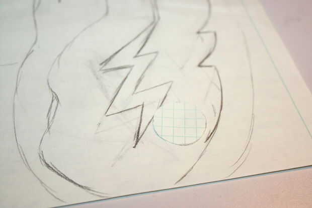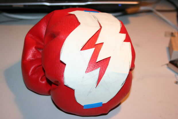 encontré que con este si los contactos están más cercanos de una pulgada aparte va al arco. No estoy seguro si no un arco es más difícil de la pistola de aturdir pero parece estar bien. Si lo arqueados sólo del arco en un punto, no constantemente de. Inicialmente iba a hacer rayas abajo del guante pero cree que un diseño del perno de relámpago tendría un aspecto más fresco. El rayo se conectará a un terminal de la picana y el círculo alrededor de la parte exterior está conectado a otro. El círculo en la plantilla es una pulgada de diámetro por lo que puedo comprobar que los cables no se llega a cerrar juntos.