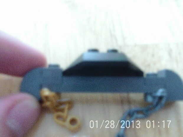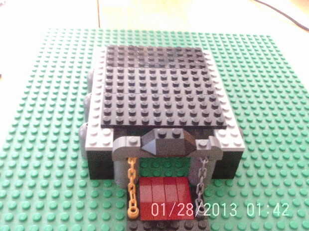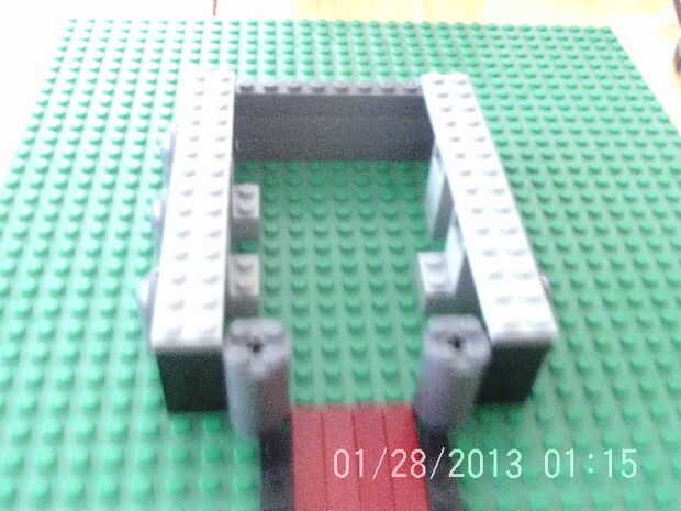 Esto es sólo el entre las conexiones desde el techo a las paredes más bajas. Primero añadir una placa gris ligera 2 x 14 a cada lado de la base. Encontrar utilizando una placa de 2 x 6 + 2 x 8 placa en su lugar. Luego armar la puerta del puente levadizo, si no tienes 2 cadenas de oro y luego usted puede pedirlos de ebay o utilizar dos gris. Entonces sólo tiene que añadir negro placas para llenar la brecha. Recuerde dejar un hueco entre la puerta del puente levadizo y el techo negro base.