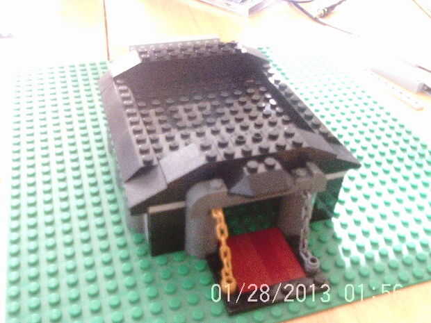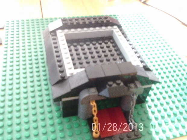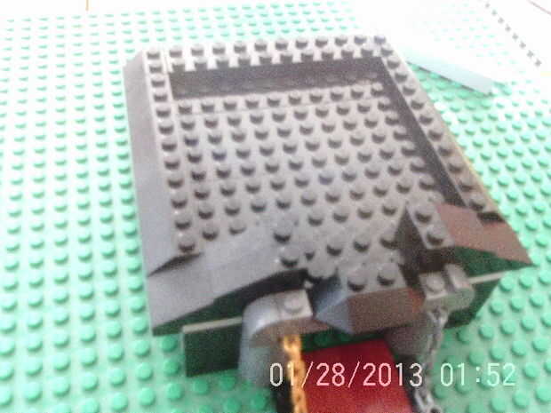 En el techo! Primero agregue las tejas en ese borde gris ligero dejando un espacio de dos postes en el frente detrás de la puerta. luego añadir el slop de 2 x 3 para iniciar la parte delantera de la azotea. Ahora construir lo que está en cuadro 4 y agregar detrás de la puerta. Por último añadir dos placas en la espalda que shure la placa y las tejas queden al ras. luego agregar las 2 pistas 2 x 3 en la parte posterior de la azotea y un 2 x 6 negro de ladrillo en el medio. Añadir el 1 x 10 luz gris ladrillos y los ladrillos gris luz de 1 x 8 para iniciar la base de la planta 2ed.