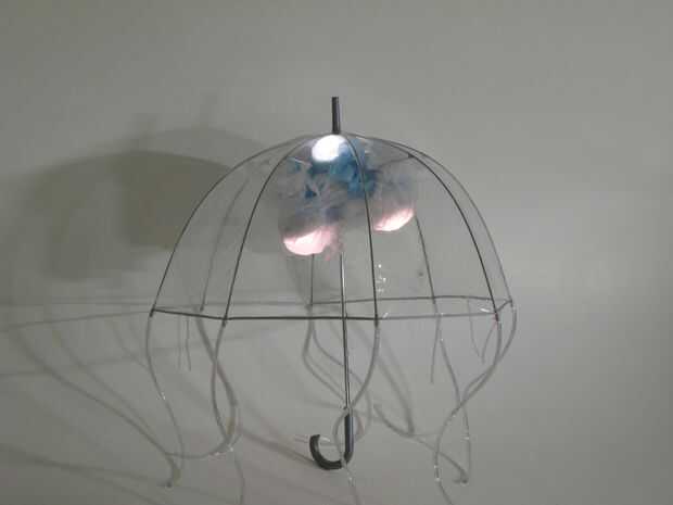 Esta parte de nuestro viaje de alta mar requiere un poco de ensayo y error artístico. Desea dar al tejido un aspecto orgánico desmoronando y liar alrededor y entre las varillas que mantienen la parte superior de la sombrilla. Otra vez utilizado mi confianza abrazaderas de plástico para colocar las luces en su lugar, atando los extremos pelados de los tejidos a las varillas de paraguas que mantienen la parte superior de la sombrilla.