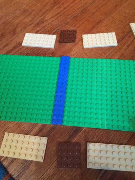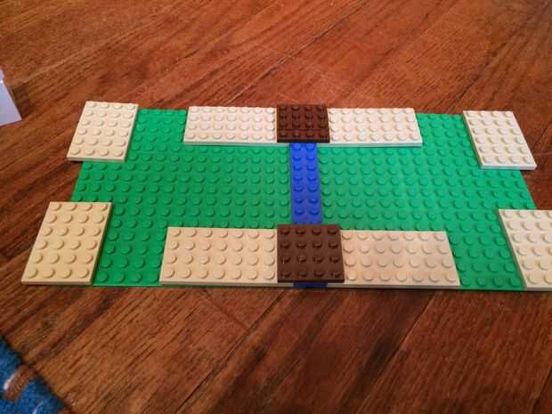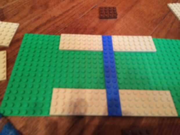 Conecte las dos placas base con el 2x8s azul. Entonces construir los caminos y puentes. Placas verticales son 4 x 8, Horizontal 4 x 6 (como en la batalla, no en las fotos). En la tercera foto, un poco puede ver donde estarán las torres