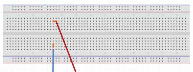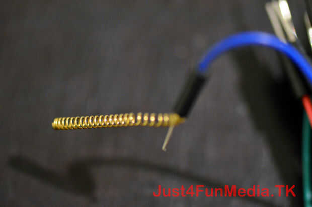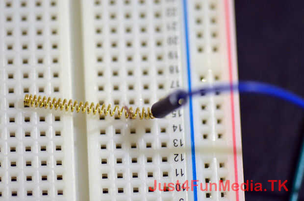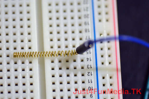 Meter el cable de acoplamiento corto en el resorte y colóquelo en la placa de pan solderless. Coloque uno de los pedazos cortos de alambre de desecho a través de la primavera en la misma fila en el tablero de pan. La distancia entre el puente de alambre y la pieza de alambre de chatarra ajustan la sensibilidad deor Ódel. Cerca del alambre de chatarra es el el puente de alambre más sensible será el sensor.