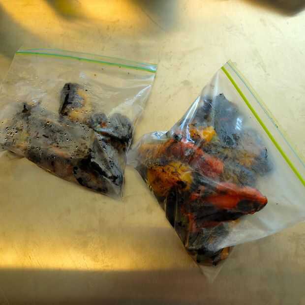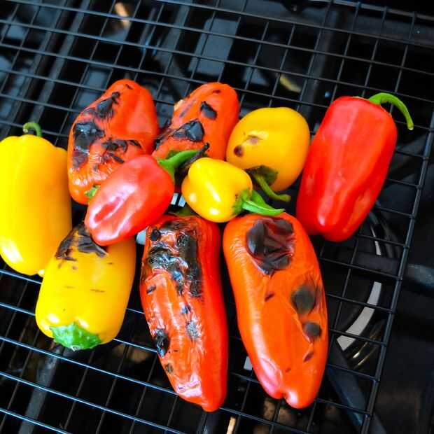 Básicamente vas a poner tus pimientos sobre un quemador de gas (o barbacoa) y charlas completamente, vuelta hasta que se ennegrecen uniformemente. Luego, colóquelos en una bolsa de plástico y dejarlos descansar. El vapor que destilan Afloje la piel carbonizada. Después de 10 minutos o más en la bolsa, puede pelar la piel carbonizada con la mano o con un cuchillo. Deseche las semillas y el tallo, y tienes los pimientos asados más sabrosos nunca.