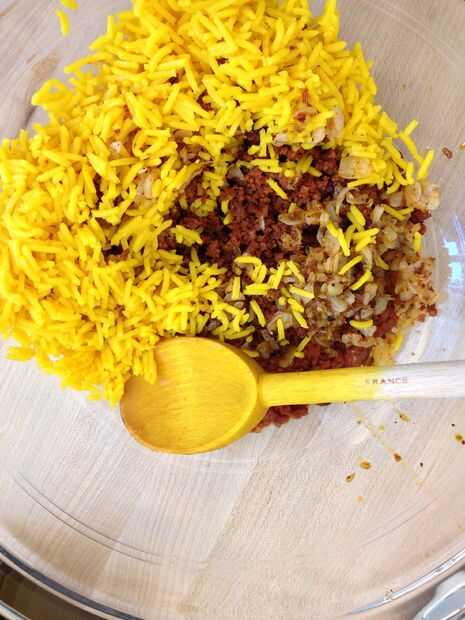 Combinar la mezcla de chorizo y cebolla con el arroz cocido en un bol. (O simplemente hazlo en la misma sartén.) Añadir algunos perejil y jugo de limón y cáscara de limón y revuelva todo. Esta es una receta muy alimonada, que creo que funciona perfectamente con el calamar, pero puede ajustar hacia abajo o dejar de lado la corteza si quieres que sea menos limón.