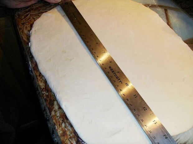 • Destapar la masa y estirar en un rectángulo de (14 x 6).  Puede que desee colocar harina durante este proceso