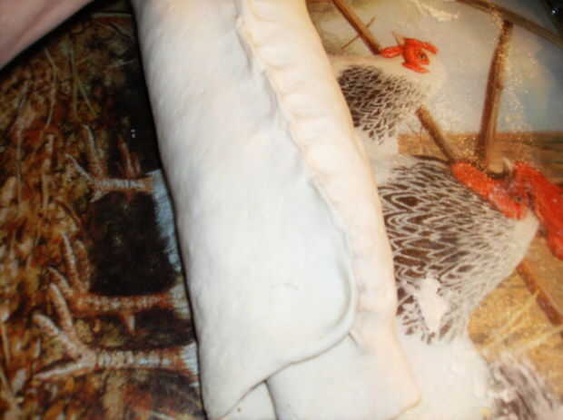 • Apriete los dos lados largos de la masa juntos después de que ha sido completamente desarrollado.  Pellizque los extremos para sellar el pan (ver fotos)