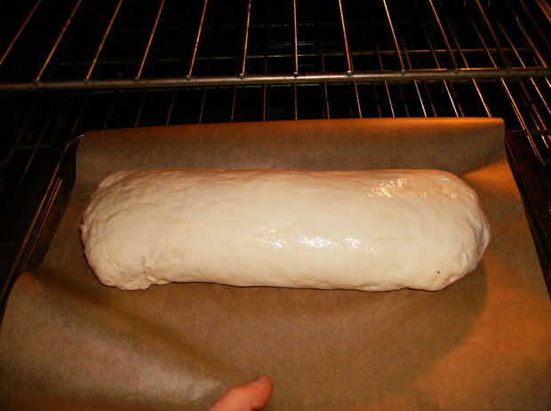 • Ponga la masa sobre la hoja de cocción parece lateral hacia abajo (utilicé papel de pergamino pero no tienes que) y añadir un poco de aceite de oliva a la parte superior e inferior de la barra de pan.