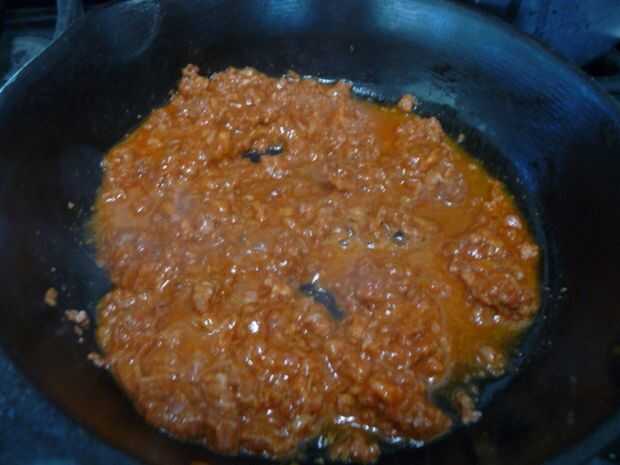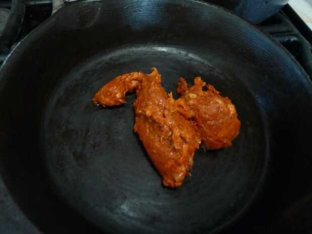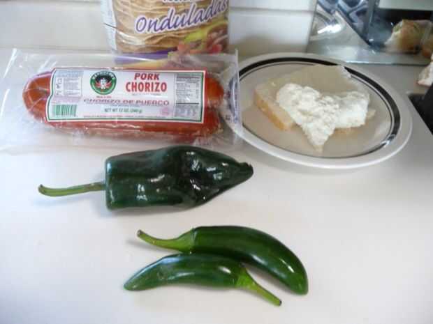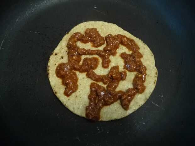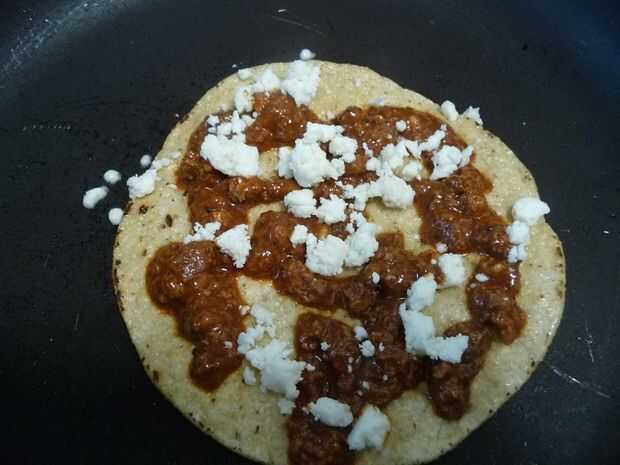 Squeeze 3 oz chorizo * de ella está cubierta en un sartén pequeño. Añadir 3 cucharadas de agua. Poner a hervir rápido, reduzca el calor y cocinar a fuego lento durante 5-7 minutos. El chorizo debe ser algo seco después de hervir a fuego lento. Agregar suficiente agua para darle una consistencia gruesa, picantes. Mantener el calor.