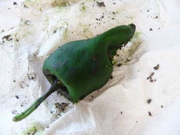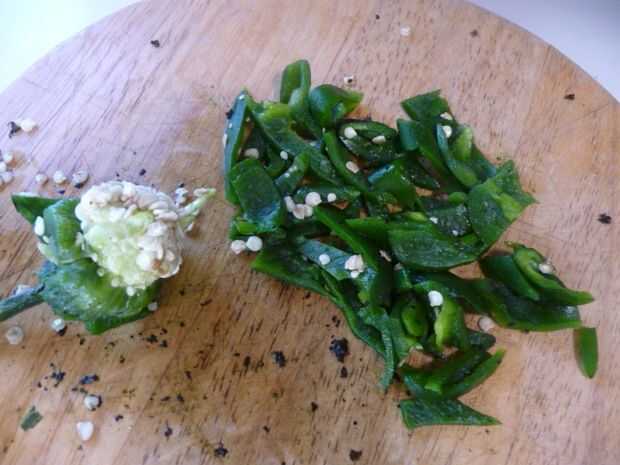 Asado de Poblano y los Chiles rojos sobre la hornilla de estufa de gas (o con un soplete) hasta que la piel es carbonizada. Coloque el chile en una hoja de papel toalla y frotar la piel ennegrecida. Cortar en tiras finas. Deseche el núcleo de la semilla. Dejar reposar los chiles en rodajas.