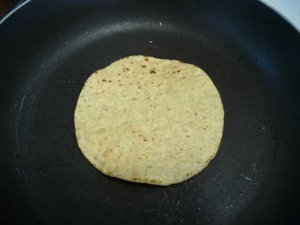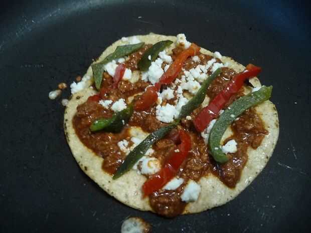 Coloque una sartén mediana sobre fuego medio alto. Añadir la Tostada y caliente durante un minuto. Gire el armazón sobre y la cuchara en la "salsa" de chorizo, el queso de cabra y chiles asados. Cocinar 1 minuto más, luego reducir el calor al punto bajo. Cocinar 2 minutos más o hasta que el queso se ablande. Use una espátula y mover la Tostada de Pizza en una placa.