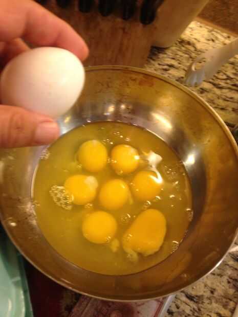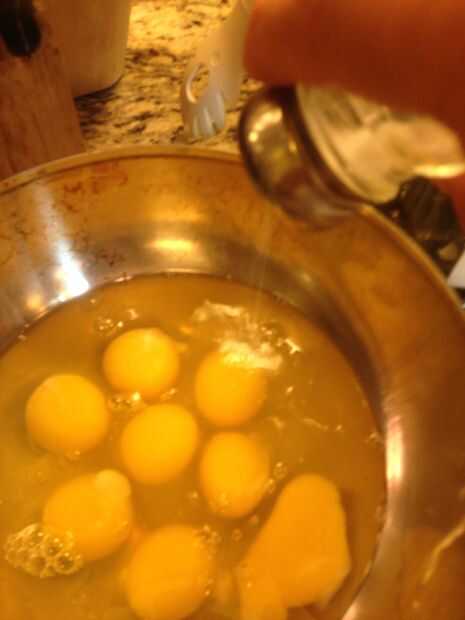 Gusta preparar mis huevos en un recipiente separado antes de empezar a cocinar. Esto me dará tiempo suficiente para asegurarse de que si consigo una cáscara de huevo, puedo lo saca sin quemar mi dedo o el plato. O accidentalmente dejando una cáscara de huevo en el plato. Odio encontrar cáscaras de huevo en mi plato mientras comen! Crack los 8 huevos en un bol. Añadir un par de batidos de sal a cada yema de huevo a tu gusto.