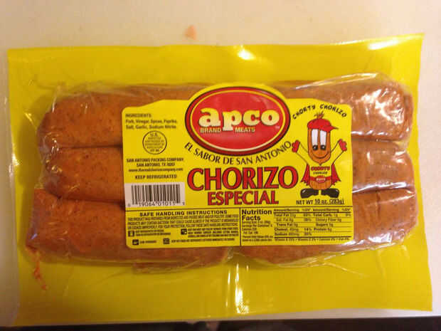 Cortar la tripa de Chorizo (salchicha mexicana). La salchicha que comprar viene en tripas individuales de 2oz. Mi familia se utiliza para esta marca Apco. Es sólo nuestra preferencia. Quitar la salchicha de la carcasa. La carcasa no es comestible.