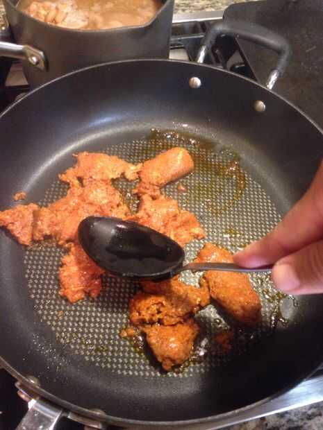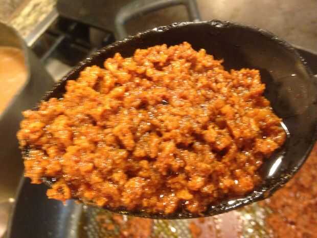 Precaliente una sartén grande a fuego medio. Coloque la salchicha o el chorizo en un sartén grande. Usando el reverso de la cuchara, Machaque los enlaces como cocinan. Continúe cocinando la salchicha hasta que se convierte en un agradable color Carmel brown (como en la foto de la cuchara completa). Algunas personas prefieren cocinar el chorizo un poco menos y dejarla un poco roja. En mi familia preferimos cocerla un poco marrón para asegurarse de que esté bien cocido. Después de todo se hace de carne de cerdo principalmente. Según el contenido de grasa de la salchicha puede tienes que añadir algún aceite (1 cucharada) en este momento.