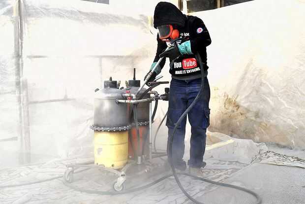 El aire se introduce por una bata que está conectada con un compresor de aire y pasa a través con la ayuda de un regulador de presión. Entonces, el aire en el tanque de presión de la arena y otra fuente se conecta con la válvula, en el que la arena es mezclada con el aire (mezcla de válvula) y a continuación, se mueve hacia el arma de la chorreadora de arena dentro de una bata. Por lo tanto, abrir la válvula nos damos cuenta que la arena sale a gran velocidad y golpear nuestro objeto tenemos el resultado que acabo de mencionar arriba. La entrada de nuestro tanque, donde se inserta la arena, se abre cuando la presión del tanque está en cero y automáticamente, se cierra cuando el aire se introduce en nuestro tanque. Este hecho hace que la colocación de la arena y el arenador de la arena extremadamente fácil de usar.