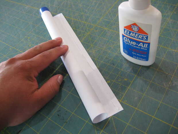 Untar una capa delgada de pegamento blanco en el borde del rollo y adhiera el papel. Rápidamente el rodillo el tubo de ida y vuelta sobre la mesa para lanzar burbujas de aire. El tubo debería poder deslizar en y fuera de la forma libremente y no estar pegado a la forma. Deje en su lugar la forma del PVC para el resto de los pasos.