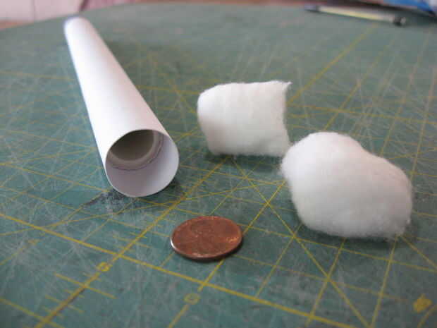 Inserte las dos bolas de algodón en el espacio abierto en su papel del tubo, justo encima de donde termina la forma de PVC. No inserte en el PVC. Coloque el centavo encima de las bolas de algodón y cinta abajo el papel sobre las bolas de algodón y penny con cinta adhesiva como se muestra en las fotos 2 y 3.