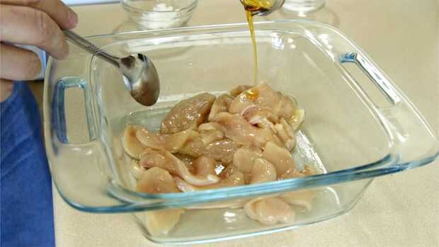 Es necesario marinar el pollo. Para el pollo en rodajas agregar 1 cucharada vino de arroz, aceite de sésamo 1 cucharadita asado, 1 cucharada de huevo, pizca de sal y mezclar bien. Ahora agregue 1/2 cucharada de maicena y mezcla hasta que no se quedan manchas blancas. Cubra y coloque en el refrigerador durante al menos 30 minutos. Esto le da tiempo a preparar las verduras.