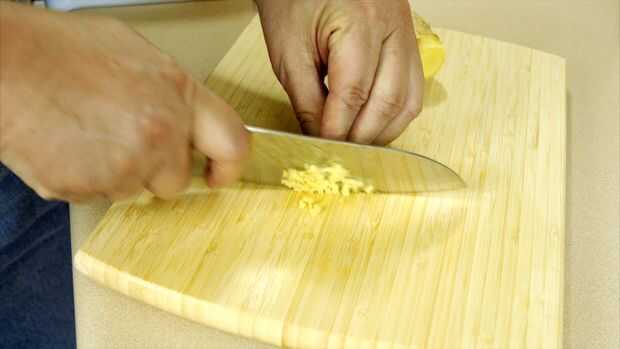 Cortar aproximadamente 1 cucharada de jengibre y 1 cucharada de ajo.
