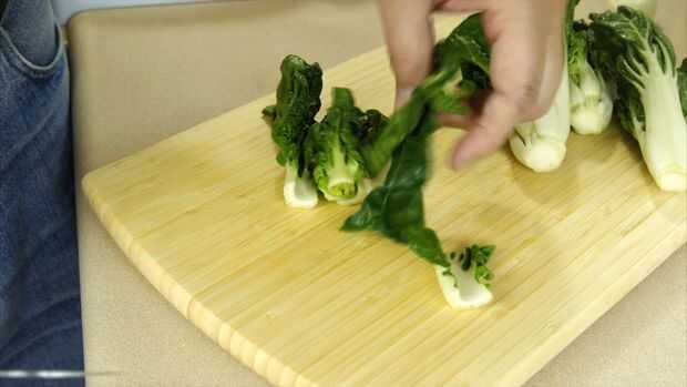 Utilicé 4 baby bok choy pero funciona cualquier cosa de la familia del repollo. Despedazar a más o menos, se reducirá durante la cocción.