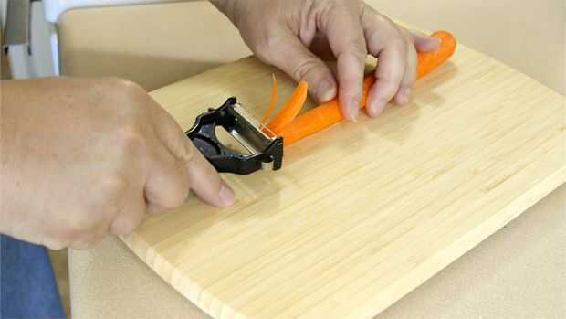Juliane sobre 1/4 taza de zanahorias. Soy perezoso, así que usar un cortador de Juliana.