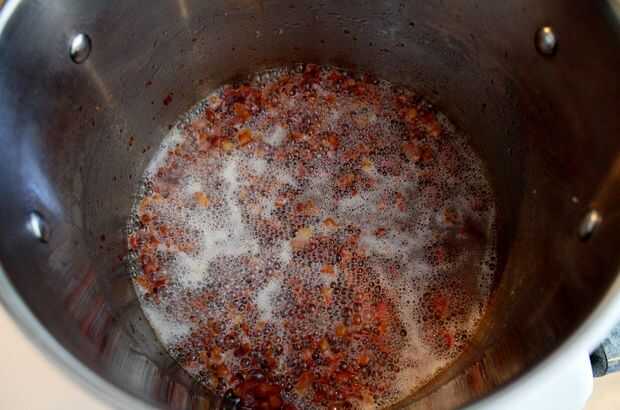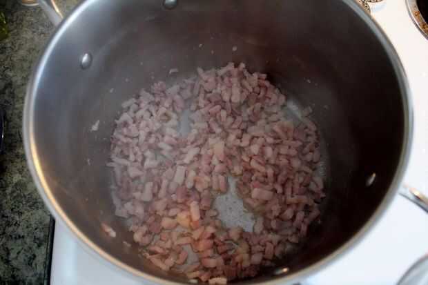 Colocar una olla de 8 qt sobre fuego medio y deje la jarra de calentarse antes de agregar cualquier cosa, esto ayuda a evitar que se pegue. Cocinar la carne de cerdo de sal a fuego medio hasta que la grasa comience a burbujas de forma, unos 15 minutos. Se desea que los bits carnosos a empezar a quedar un poco crujiente.