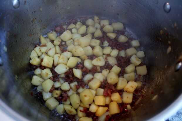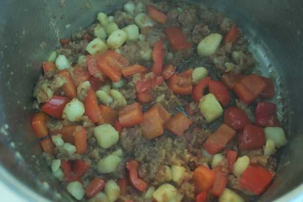 Nota: Preferimos tener patatas suaves en mi chupes sin embargo si desea tenerlos un poco más firme entonces agregar los pimientos en el mismo tiempo que las patatas. También como para tener una contracción poco dejaron en el pimiento rojo otra vez ajustar el tiempo de cocción según su gusto personal y considerar cortarlas un poco más pequeño.