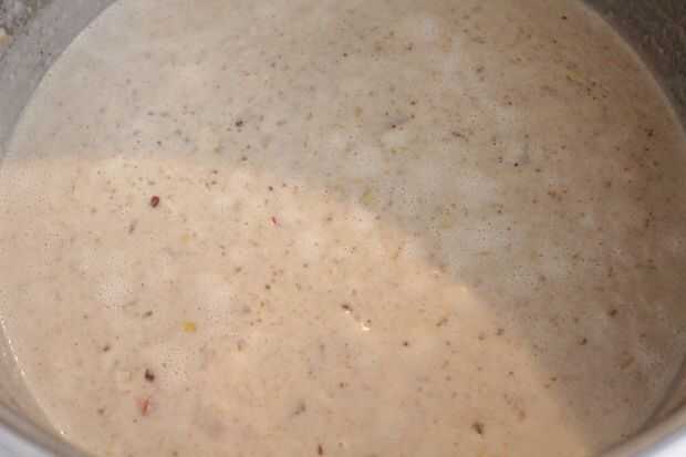 Una vez que todo ha agrupado juntos es hora de añadir el resto de los ingredientes. Añadir la crema maíz, maíz congelado, tanto cremas, Tabasco, hoja de laurel, pimienta blanca y ajo en polvo. Revuelva ocasionalmente hasta pequeñas burbujas se forman en la parte superior como en la fotografía superior, unos 15-20 minutos. Reduzca el calor y cocinar a fuego lento cubierto durante 45 minutos a una hora, dependiendo de cómo gruesa te gusta chowder. Continuar revolviendo de vez en cuando durante el simmer.