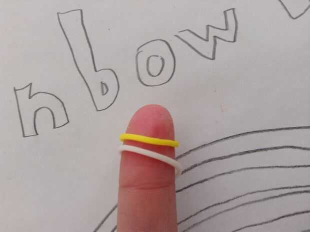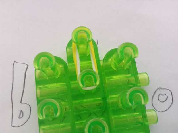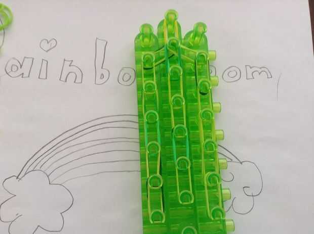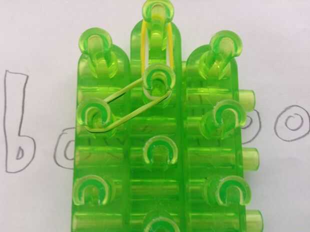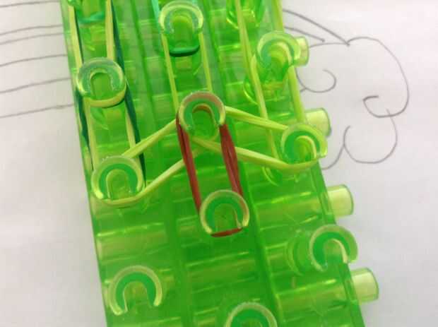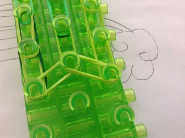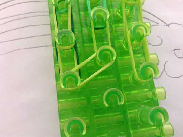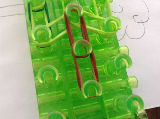 Tomar un amarillo y una banda blanca. Se trata de la estrella. Colóquelas en las clavijas de medianas superior de su telar. Coloque bandas verdes (todos se duplicará) abajo a la izquierda y a la derecha. Coloque bandas verdes hacia abajo cinco veces en cada fila. Coloque bandas verdes hacia abajo otra vez a la derecha y la izquierda. Coloque bandas marrón doble hacia abajo dos veces.