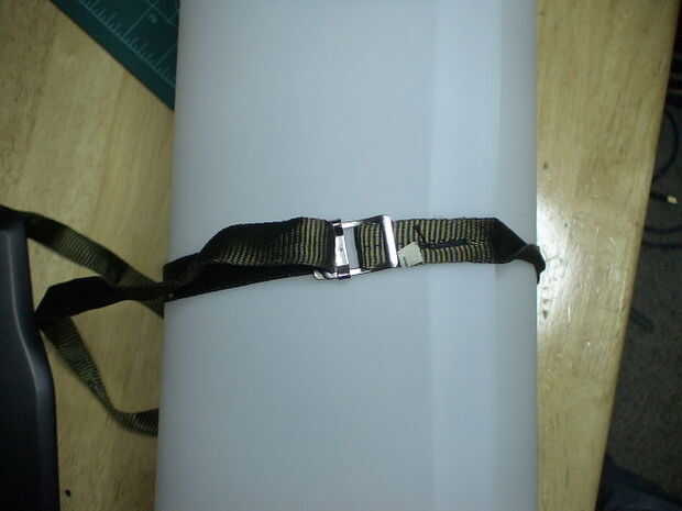 Creación del tubo: Las láminas de plástico, que era 50mil HDPE, con una textura áspera, tiene que ser formado en un tubo con un 6" diámetro interior. He encontrado que usar una correa o una especie de cinturón, que puede ser ajustado y se deslizó alrededor de ayuda con este paso.