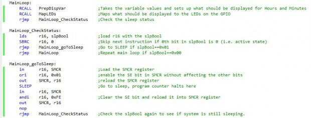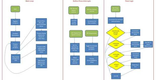 El flujo de la lógica del SW para el reloj se muestra arriba. Programación se realizó enteramente en Asamblea, implementar las características de interrupción, ADCs, administración de energía, GPIO y temporizador del ATmega328P. Las razones que elegir que Asamblea para mi lenguaje de programación fue para optimizar mi programa lo mejor podía y ya mí orgullo en el trabajo más difícil, bajar los niveles para proyectos.