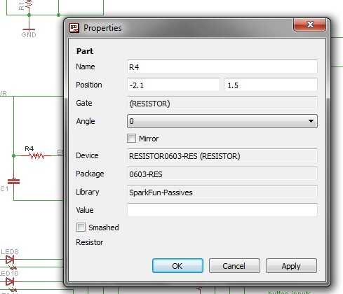 Ver esta ventana haciendo clic derecho sobre la parte y elija "Propiedades". Se puede ver que el nombre del paquete para esta resistencia es "0603-RES". Esto significa que en la carpeta "Model" que contiene SketchUp modelos deben también ser nombrados "0603-RES".