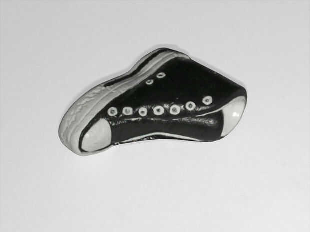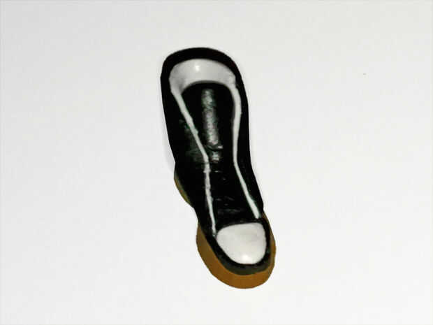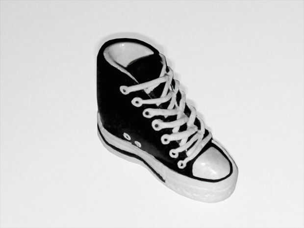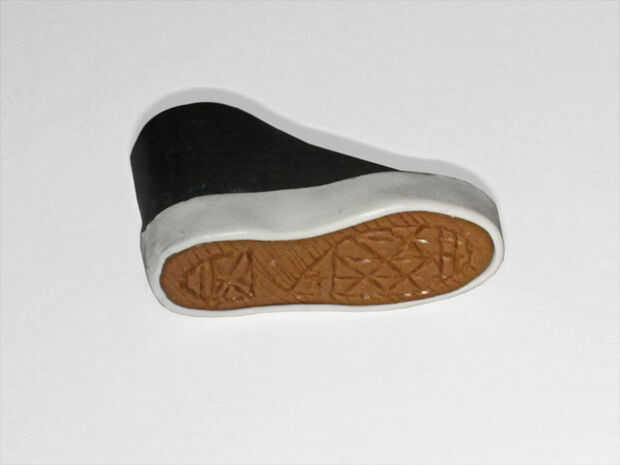 A continuación necesitarás un trozo de arcilla blanca para modelar una puntera. Una vez has fijado, añadir una franja pequeña y fina de negro al borde de la puntera (como se muestra en las imágenes) para imitar el verdadero Chuck Taylor All Star. (Parcialmente pueden traslaparse los lados de la suela para colocar más fácil).