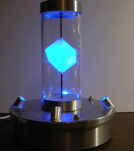 Enfoque de diseño: Basado en las imágenes de la televisión - un cubo blanco gira dentro de un cilindro largo de plástico con dos bien mecanizadas de aluminio tapas superior e inferior. Asamblea del cubo y el cilindro se asienta en una base redonda de metal con cuatro luces brillantes en el cubo que gira.