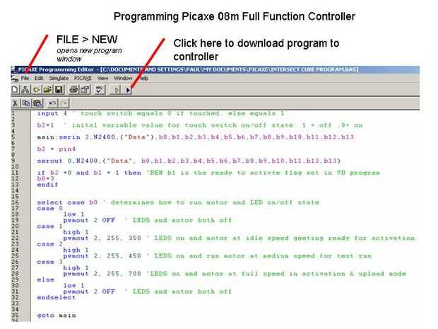 Hay unos ajustes iniciales (como Puerto Com) a realizarse en Editor de programación de Picaxe Software, ver el menú de ayuda, sobre todo "Manual 1 - Inicio de moverse".