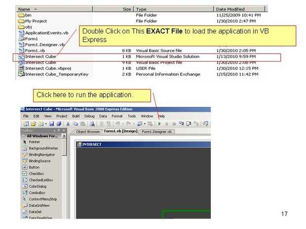 doble clic sobre ese archivo exacto debe iniciar la aplicación en Visual Basic Studio Express. Tarda un rato en cargar la primera vez.
