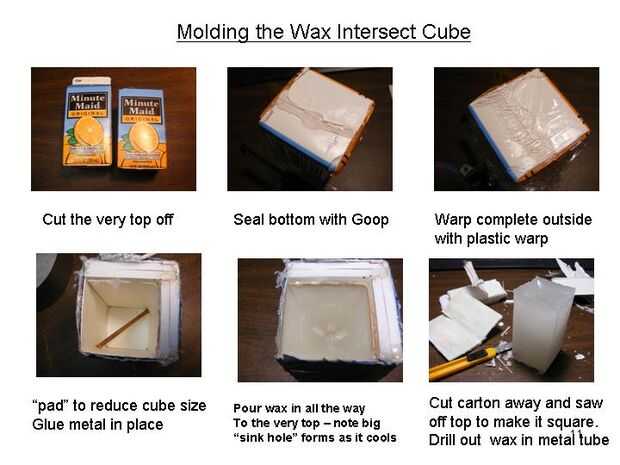 1. el molde básico está hecho de un cartón de papel encerado de 10 oz. He utilizado el contenedor de "Minute Maid" OJ de Burger King - necesitarás dos cartones. Aunque la caja tiene OJ bien, saldrá cuando viertes la cera caliente. Para evitarlo - frotis de pegote en la parte inferior de la caja y luego realizar un "pañal" con envoltura de plástico (yo usé Reynolds sello hermético), use cinta adhesiva para sostener la envoltura hacia el exterior de la caja. Cortar la parte superior del recipiente - tendrá altura máxima para compensar el agujero del fregadero que formas como la cera se enfría, ver comentarios adicionales abajo.