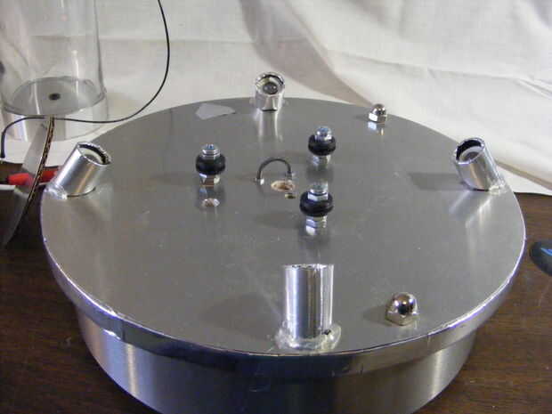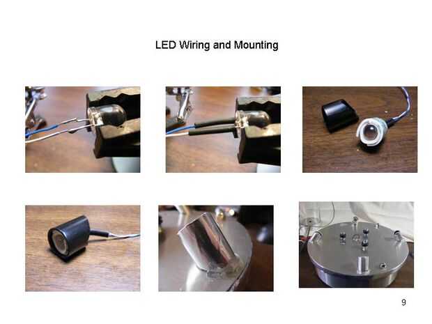 4. Deslice los LEDs en los tubos y los cables que vaya a través de los agujeros de 1/4 de pulgada perforados en la placa base de la curva. Coloque los tubos de LED de manera que apunten hacia el cilindro. La base del tubo debe extenderse casi hasta el borde exterior de la placa base. Fijar los tubos a la placa base con una pistola de pegamento caliente.
