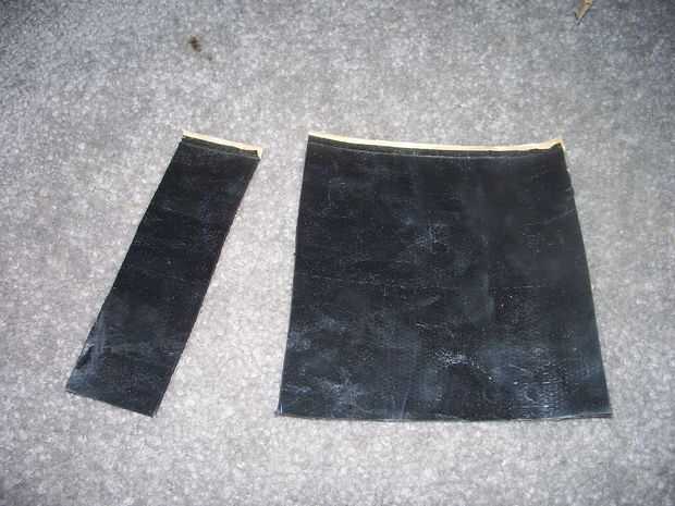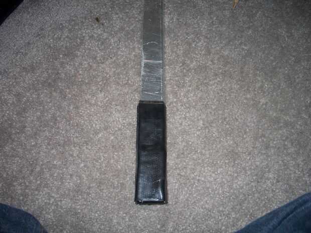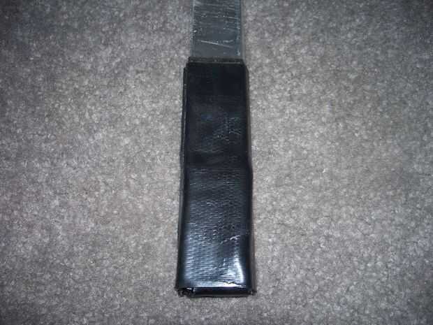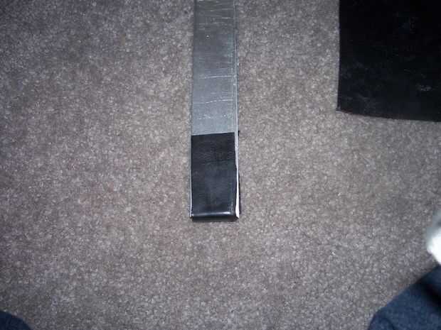Cortar dos piezas del tapajuntas, una cerca de una pulgada y media de ancho por 6 pulgadas de largo, y luego un seis por seis pulgadas cuadrado. Primero pelados y envuelve la pieza delgada de la parte trasera en la parte inferior y al frente. (ver imagen 2) Luego envuelve el seis de seis Plaza alrededor de la manija. (imagen 3 y 4)
