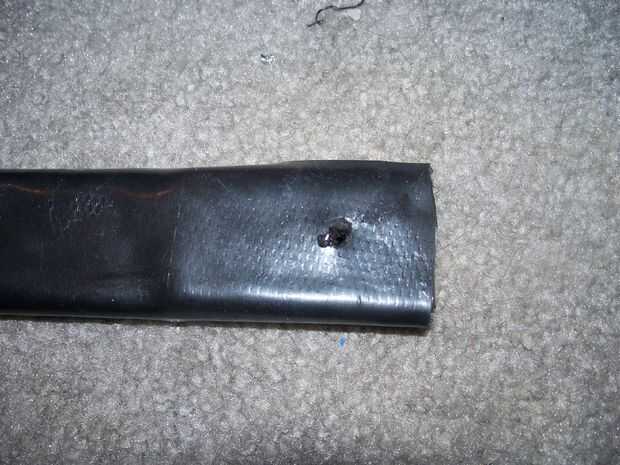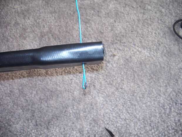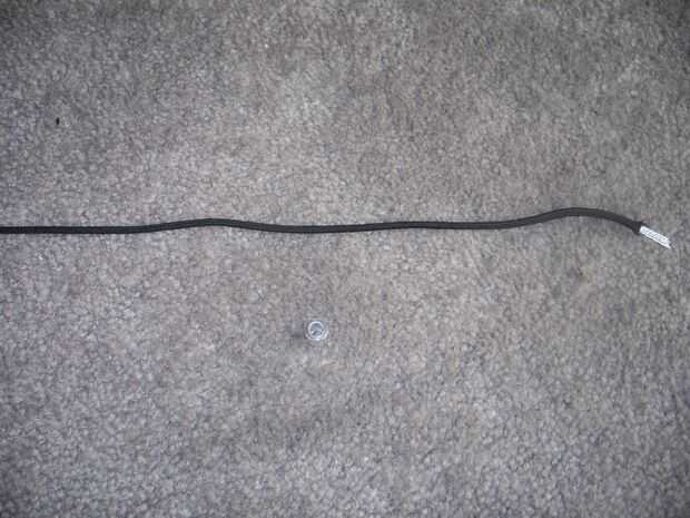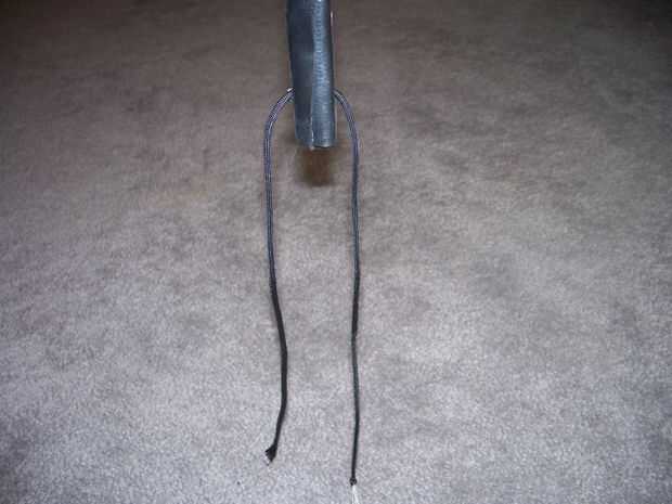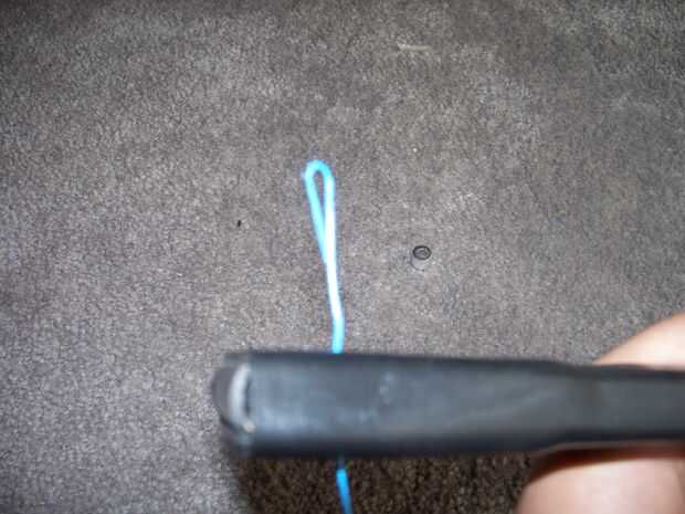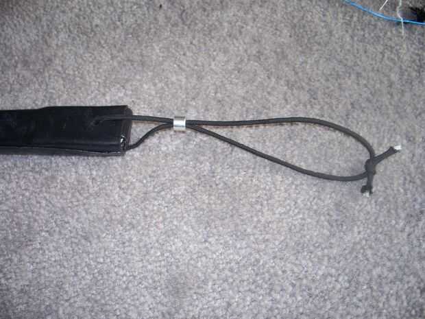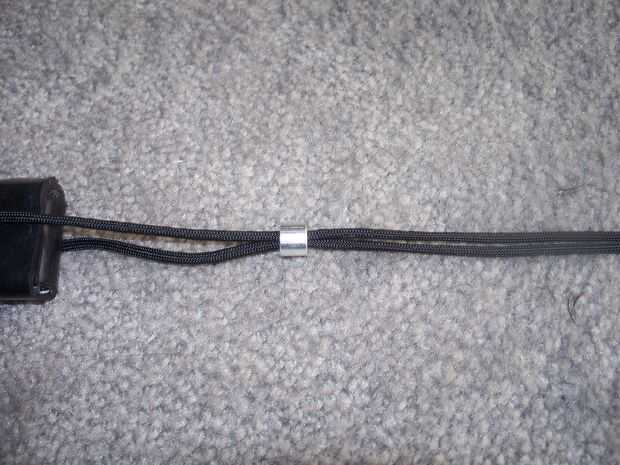 Utilicé cable de paracaídas y una pequeña cantidad de metal que tenía puesta alrededor para hacer mi cordón. Pasa por el mango con un trozo doblado de percha que utilizo para atar el nudo. Un nudo bonito Plaza para cerrar los extremos.