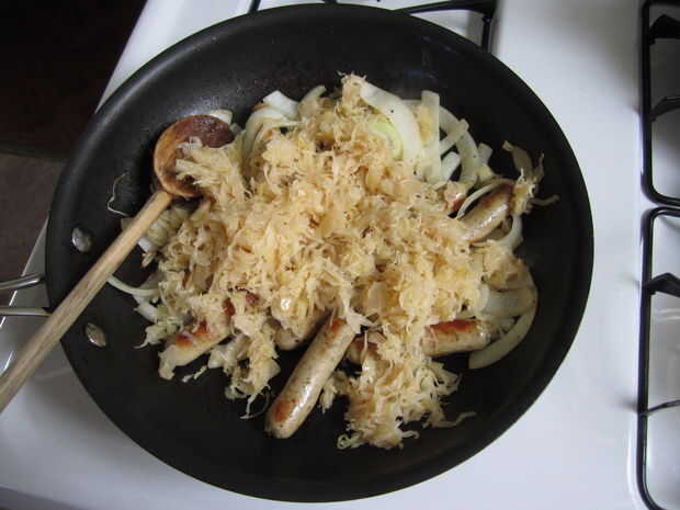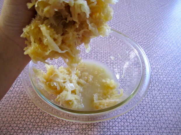 Exprima el kraut (Foto 3 le dará una buena idea de a cuánto líquido está allí!) y poner en la sartén.