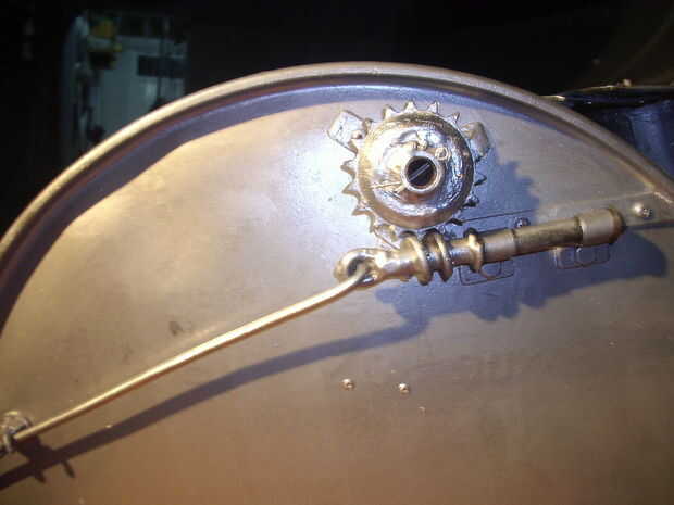 Al principio, pensé que el sistema tradicional de mango y crick, pero luego decidí hacer una impulsión del engranaje de tornillo base y salió bastante bien. Una vez comprobado que funciona, atornillado al tubo principal dos trozos de cadena, los extremos soldados las asas de la red. Girando el tubo lugar la parrilla, y hacia la izquierda desciende.