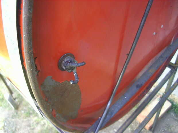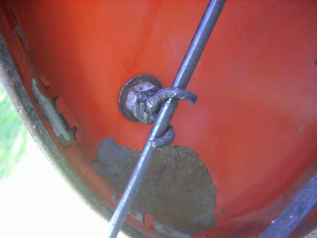 Con la manija de los engranajes de tornillo vi dos posibilidades: si era fijo, sería incómodo que se pega a un lado, queda colgada o doblada, requeriría utilizando ambas manos para manejarlo. Se me ocurrió una idea muy simple para superar el problema: un aparato ortopédico removible. Fui a través de un tornillo de metal en el tambor donde el mango podría fijarse, alas a la tuerca de soldar y soldar un sacacorchos cruzado a la cabeza del tornillo. Gira 90 grados, el eje de la palanca entra el sacacorchos, y vuelve a girar 90 grados, el sacacorchos atrapa el eje con firmeza, permitiendo manejar el mecanismo con una mano mientras está en uso.