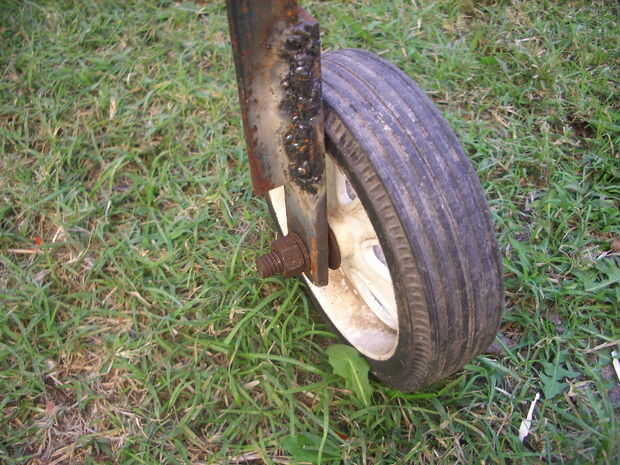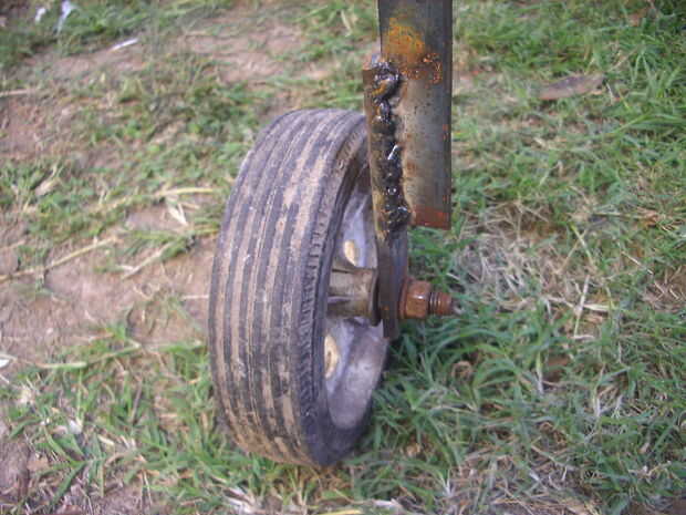 Primero hice un marco rectangular de 0,50 x 1,50 m con el hierro de L, que estén soldadas en el medianas dos vigas que había encerrado como una cuna del tambor vacío. En este marco soldado cuatro patas, tratando de permanecer erguido. Dos de las patas de un extremo soldado a dos refuerzos de hierro plano separado 3"/ 16 x 1", que se atornillan las ruedas que pertenecieron a un cortacéspedes de césped y que alguien tuvo la brillante idea de tirar la basura cerca de mi casa. En las otras dos patas soldadas asas pequeñas, para evitar cavar en la tierra. Se unió a las patas por un rectángulo refuerzo de la plancha de L mismo. En ese momento me di cuenta de que las piernas eran unas pocas pulgadas más adecuado y aprovechó la oportunidad para hacerlos extensibles, corte sobre a medio camino para arriba y haciendo una pequeña prensa de tornillo cada uno para cambiar su longitud. Haciendo esta tarea era el disco bloqueado y he conseguido una desagradable herida en la mano derecha. El accidente me llevó dos días de taller.