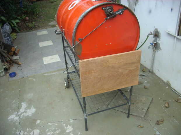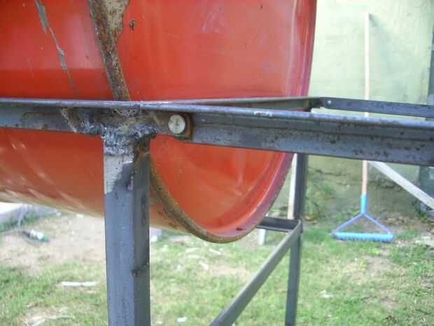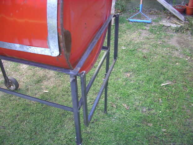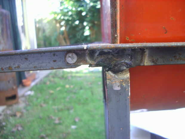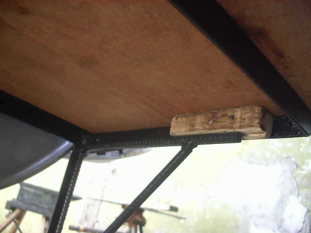 Corte un extremo de la estructura, que desde ese momento designó como lateral derecho y había soldado a dos pequeñas bisagras con barra plana 1"/ 2 x 1" / 8, también articula con remaches de hierro de 5 mm de diámetro. Para mantener horizontal la mesa pensé utiliza cadenas o cables de freno de bicicleta o un apoyo, pero finalmente me decidí a hacer dos soportes triangulares con varillas de hierro de 8 mm. Les soldados al chasis con arandelas para que puede girar sobre un eje vertical y servir como soporte a la parte plegable cuando está abierto. Compré dos tablas de madera duras y atornillada sobre esto. Pegamento blanco añadido dos madera se detiene para los soportes fácilmente se ponen en su lugar.