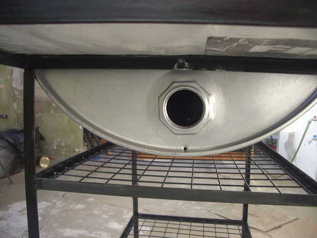 Es la tubería que luego cuelgue la rejilla. Utilicé uno de los orificios que trajeron el tambor en la parte superior, el más pequeño, para servir como un centro de la tubería que fue a apoyar la red. Como se hizo el orificio con hilo, había atornillado herméticamente un pedazo de la vieja tubería que fue como arbustiva en el lado izquierdo. En el lado derecho hizo un agujero en forma de estrella para garantizar otro cubo. Para asegurarse de que ambos centros están alineados, los montada en posición con el tubo puesto en marcha. Puse tres lengüetas de hierro plano, más o menos uniformemente distribuidos alrededor de la zarza, POP remachado en la placa y luego soldadas a lo bush. De esta manera, el agujero más grande en la parte superior del tambor fue, que viene muy bien para servir como entrada de aire fresco cuando la tapa bien cerrada.