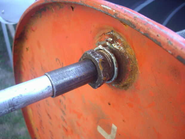 Usé uno de los agujeros traía el tambor en la tapa, el más chico, para servir de buje al caño iba a donde la parrilla. Como el agujero venía con rosca hecha, atornillé fuertemente un trozo de caño viejo quedó como buje en el extremo izquierdo.