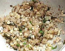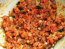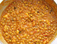 Aplastar la mitad de los garbanzos cocidos y mantener a un lado. Tomar una sartén y algunas cucharadas de aceite. Agregar cebolla en rodajas y freír por unos minutos. Luego agregar los tomates en rodajas y deje cocinar durante pocos minutos. Ahora añadir garbanzos roto. Junto con agregar guisantes restantes. Agregar poca agua para lograr una consistencia de salsa. Ahora es tiempo de añadir picante todos polvos cilantro, redchilli, chat masala, sal. Mezcle bien y deje para cocinar por unos minutos hasta que todas especias se mezclan adecuadamente con garbanzos.