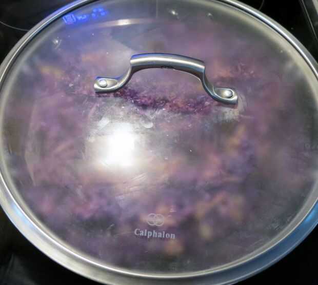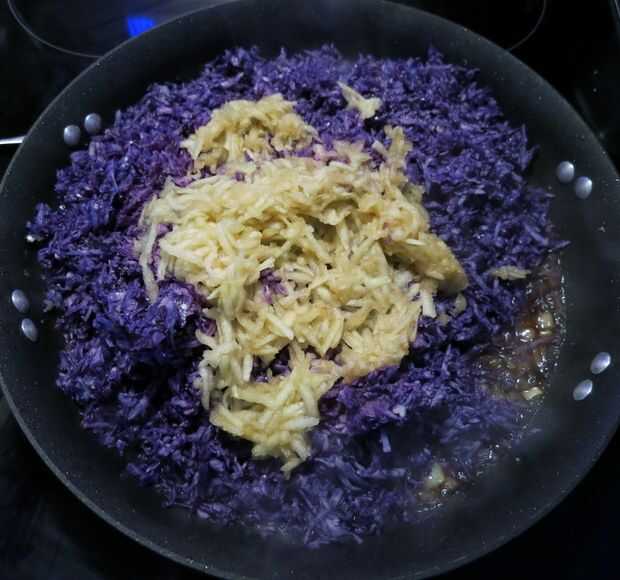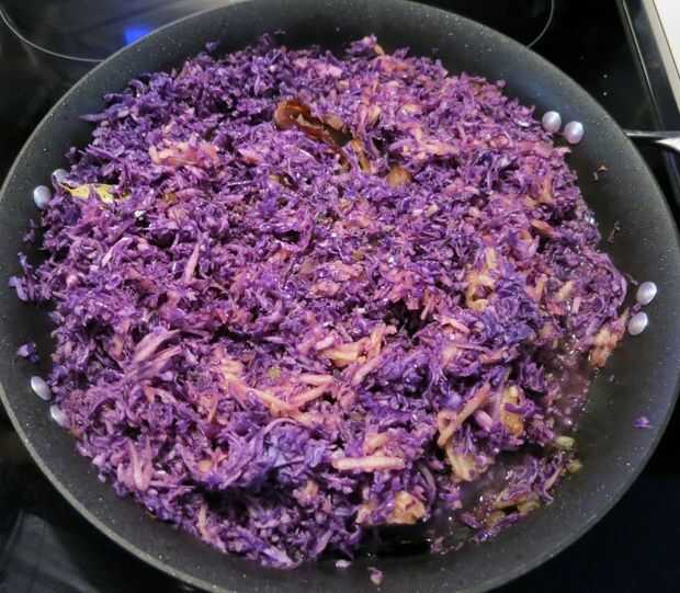 Añadir la col, sidra, manzana, panela, hojas de laurel y tomillo y cocine, cubierto, hasta que el repollo se ablande, aproximadamente 15 minutos.