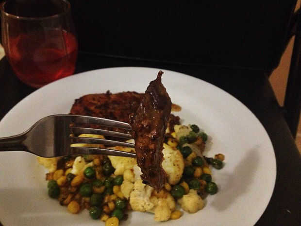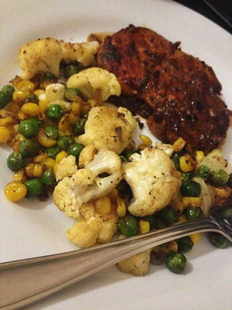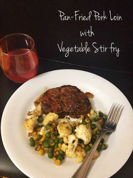Chuleta de cerdo (lomo) se cuece en fuego medio ajo, cebolla, orégano seco y caldo de pollo. Son jugosos, tiernos y deliciosos. Serví con unos vegetales salteados y una taza de bebida. Esta combinación sería gran fecha cena.