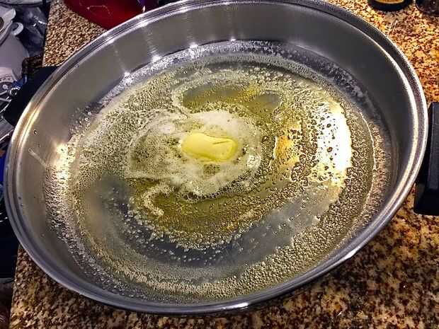 Sazonar ambos lados de las chuletas con sal, pimienta y cebolla en polvo. En una sartén cubierta, añadir el aceite y la mantequilla, derretir a fuego medio.